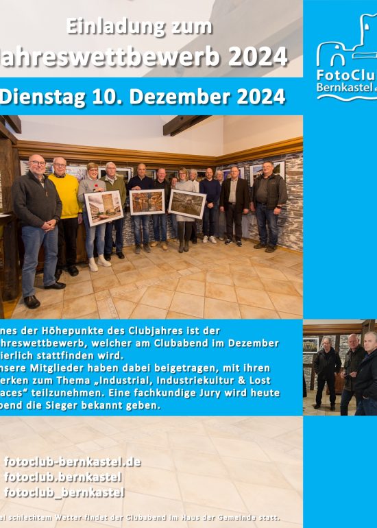 10. Dezember 2024 Siegerehrung des Jahreswettbewerbs Am 10. Dezember trafen sich die Mitglieder des Fotoclub Bernkastel e.V. traditionell zum letzten Clubabend des Jahres im...