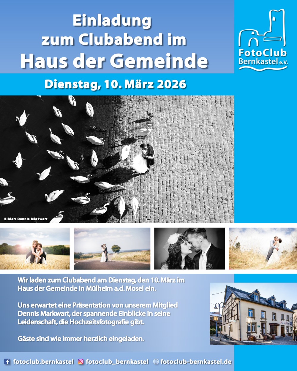Dienstag 10. März 2026 Clubabend mit Vorlesung Am kommenden Dienstag, den 10. März, laden wir herzlich zum Clubabend im Haus der Gemeinde an der Hauptstraße 60 in Mülheim a.d. Mosel ein. Uns erwartet eine Präsentation von unserem Mitglied Dennis Markwart. Er wird uns Einblicke in seine Leidenschaft, die Hochzeitsfotografie geben. Gäste sind herzlich willkommen.